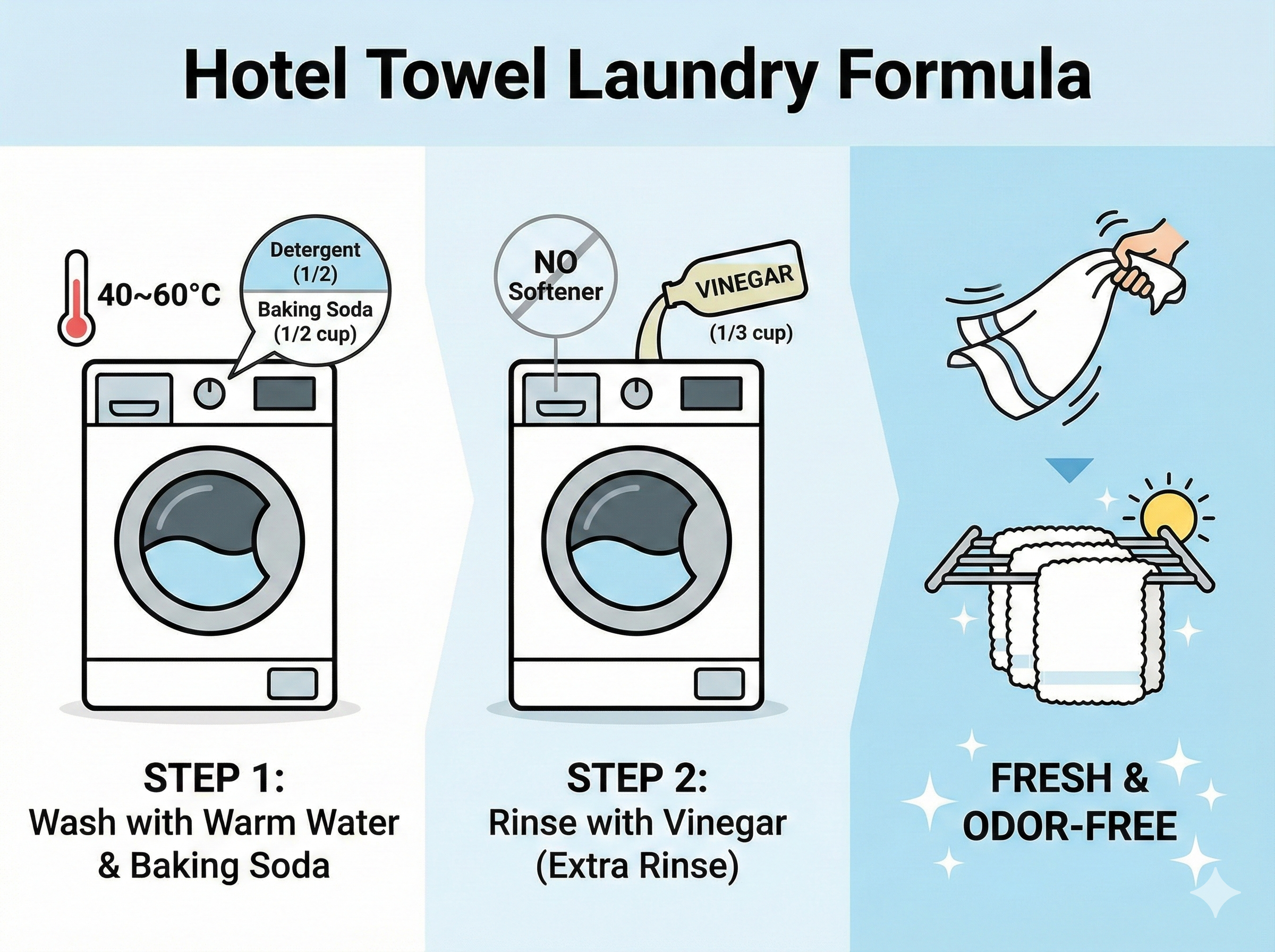 저도 처음엔 "식초까지 넣어야 하나?" 싶었지만, 이 루틴을 시작한 뒤로 3년째 수건 쉰내를 겪어본 적이 없습니다. 호텔 같은 뽀송함을 유지하는 비결은 결국 세심한 온도 조절과 천연 재료의 활용에 있습니다. 오늘 내용을 딱 세 가지만 기억하세요.